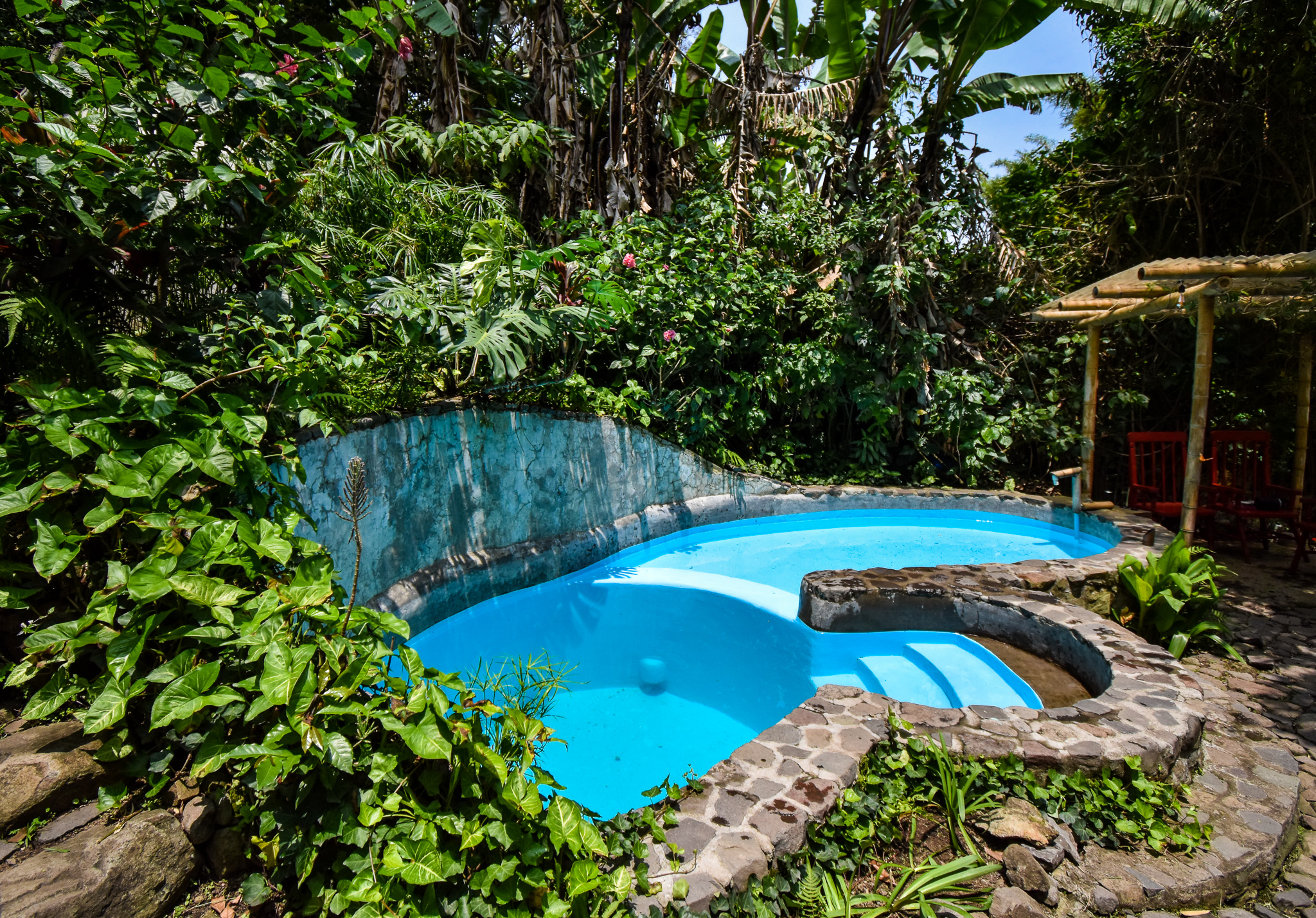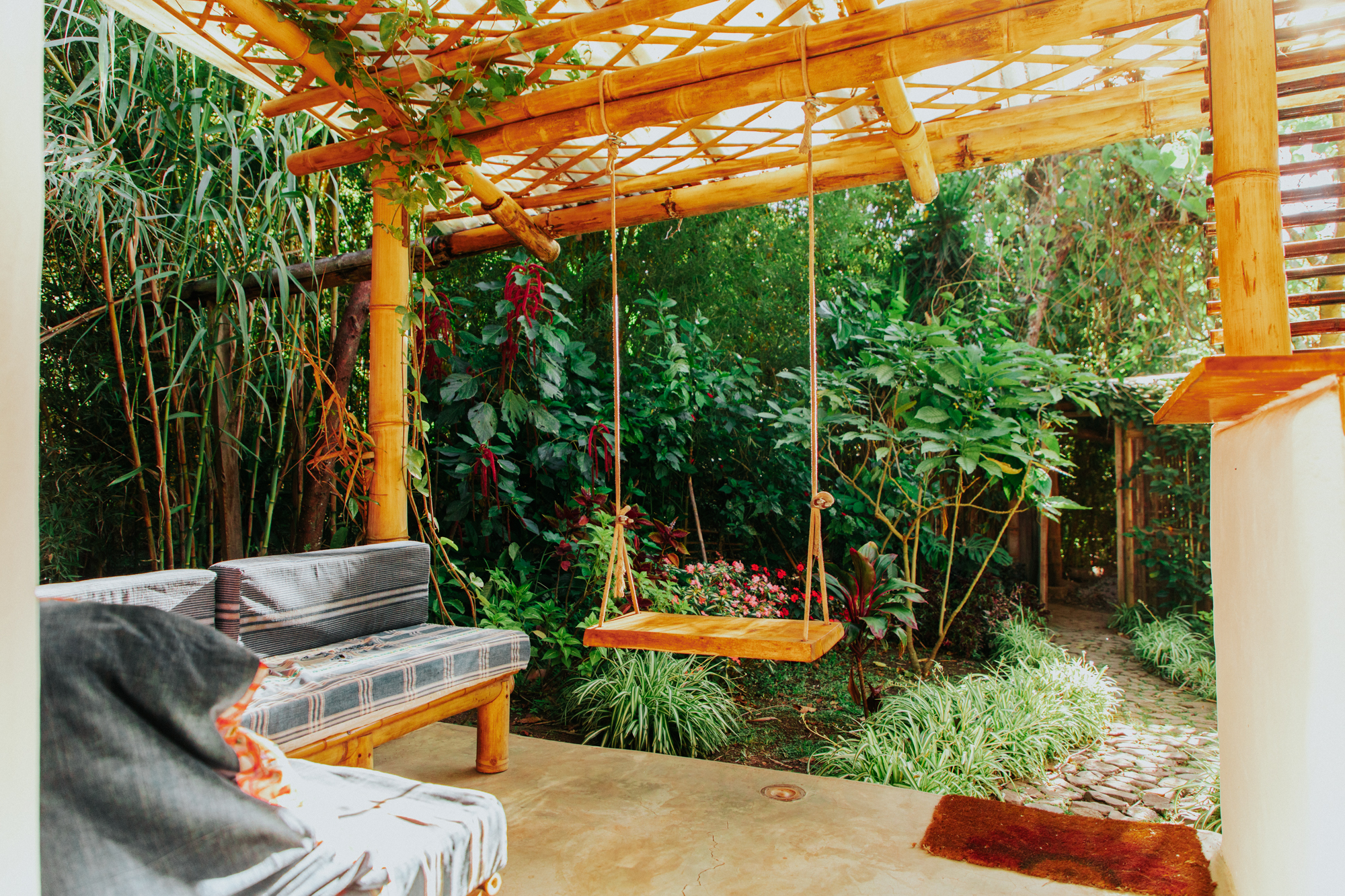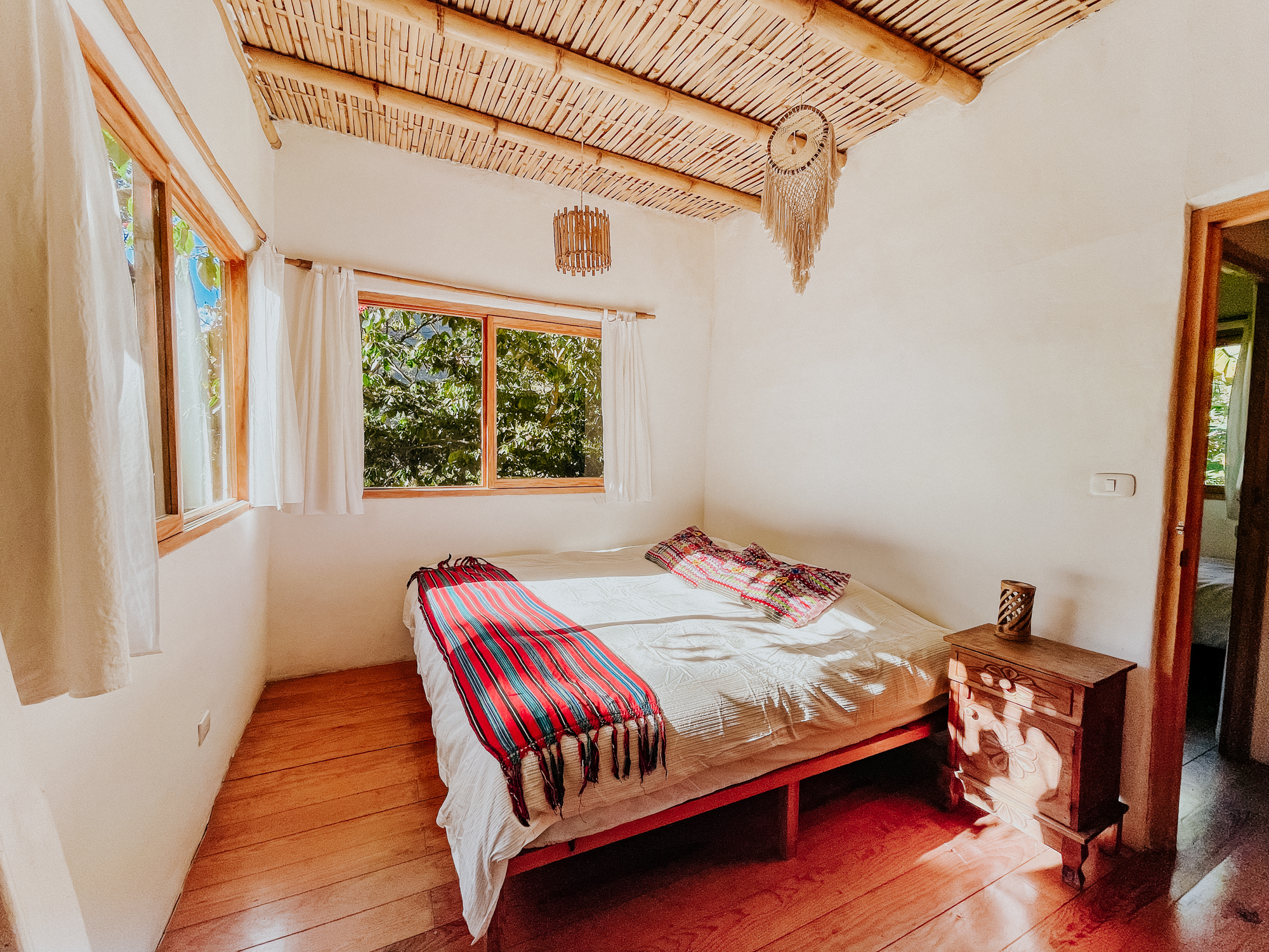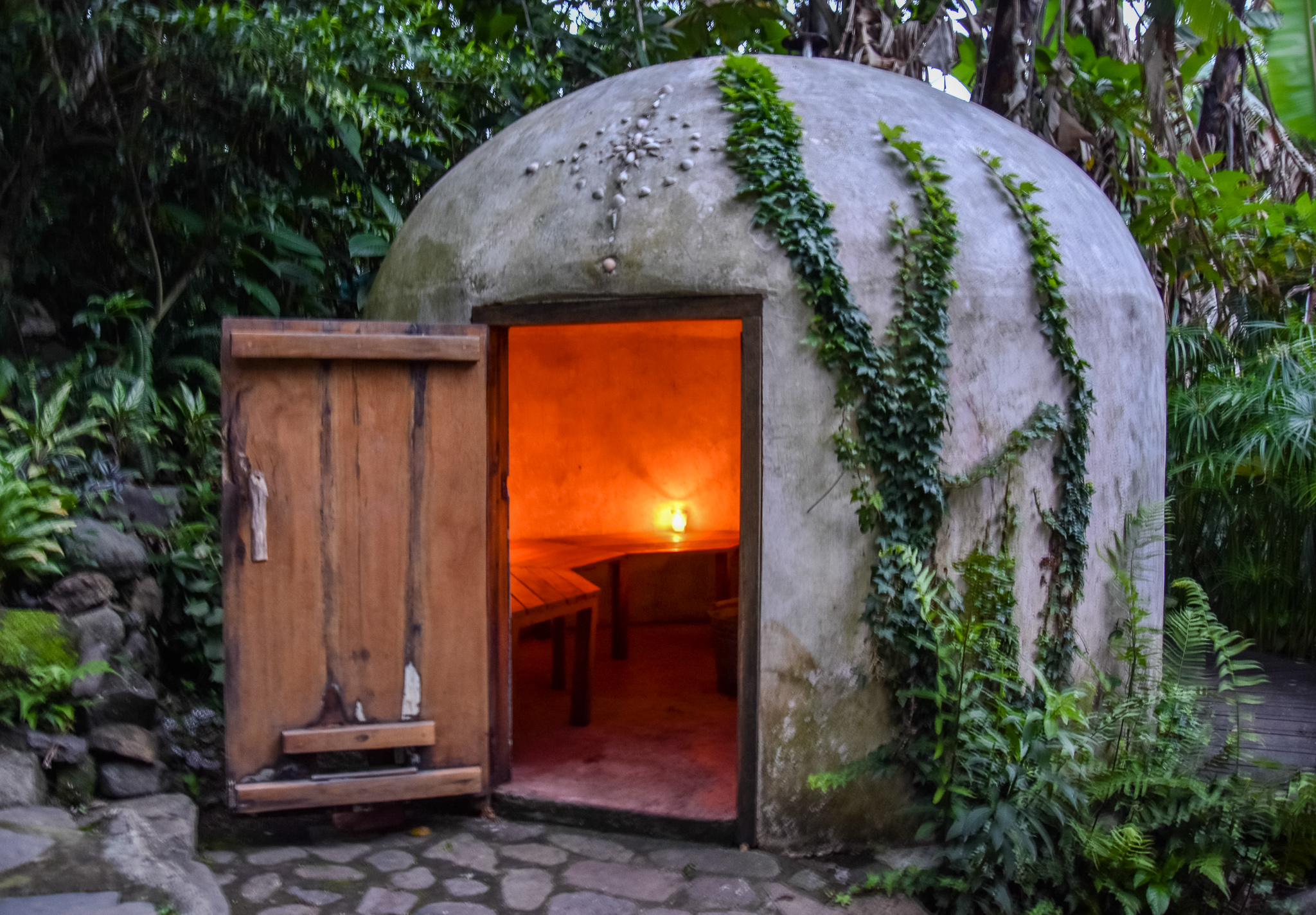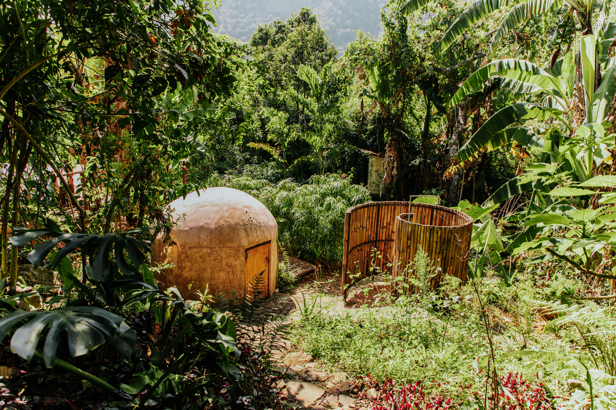 Here you will find a massage cabin hidden amongst the raspberries, a chemical-free plunge pool – fed by our spring water well and, in turn, feeding the gardens – and our temazcal, a modern interpretation of a traditional Mayan sauna, created using traditional bajareque construction techniques and multi-functioning as a sound dome. The grounds are also home to a handmade beautiful outdoor shower and dry toilet, as well as covered parking for two cars.