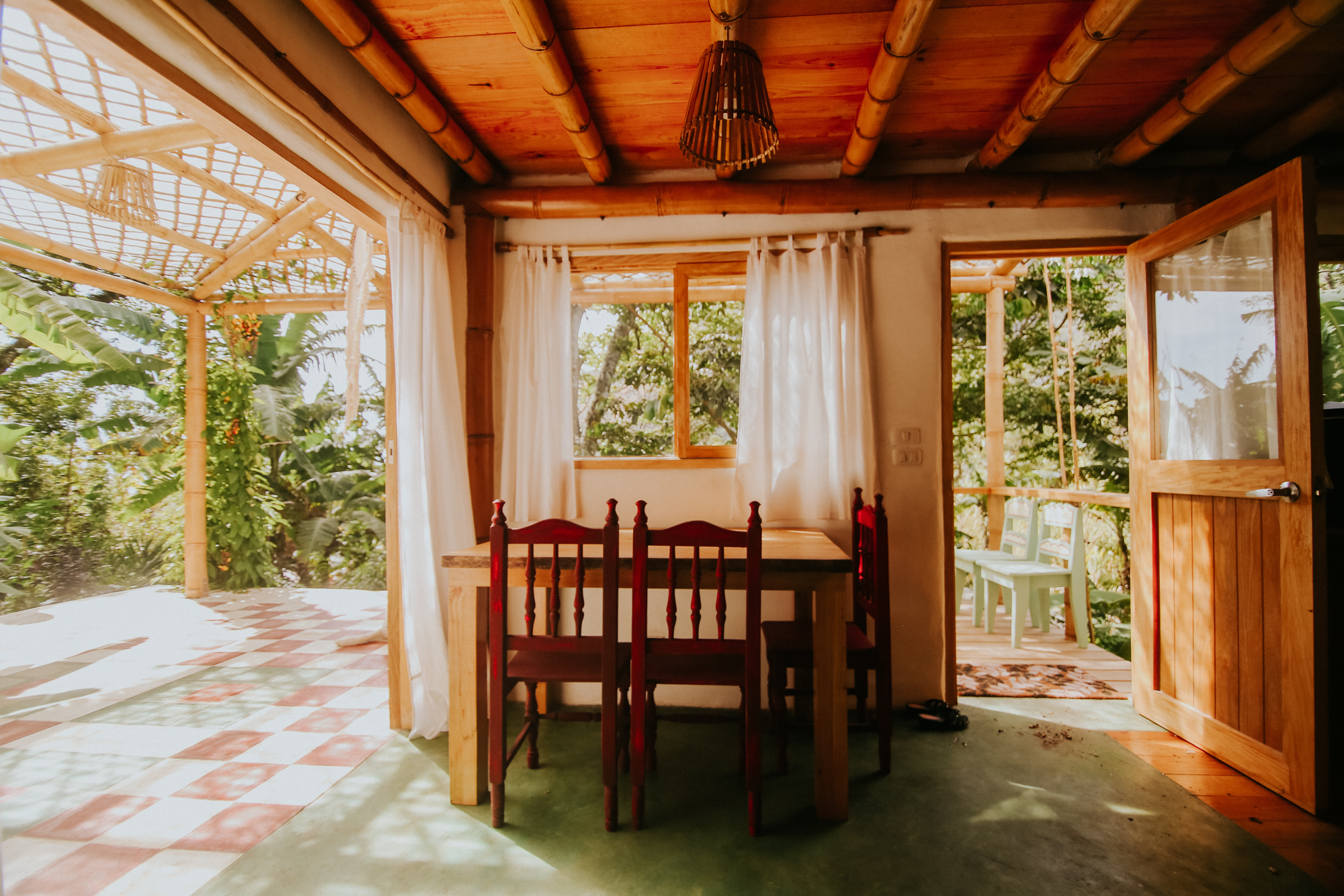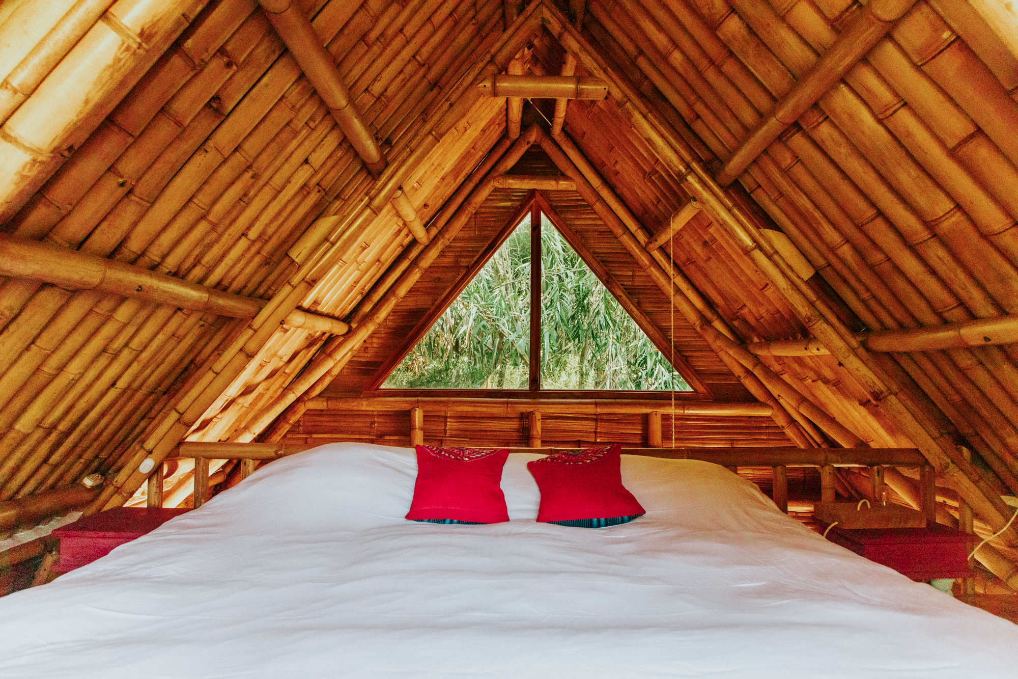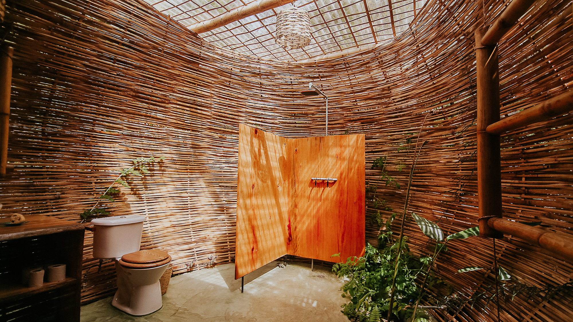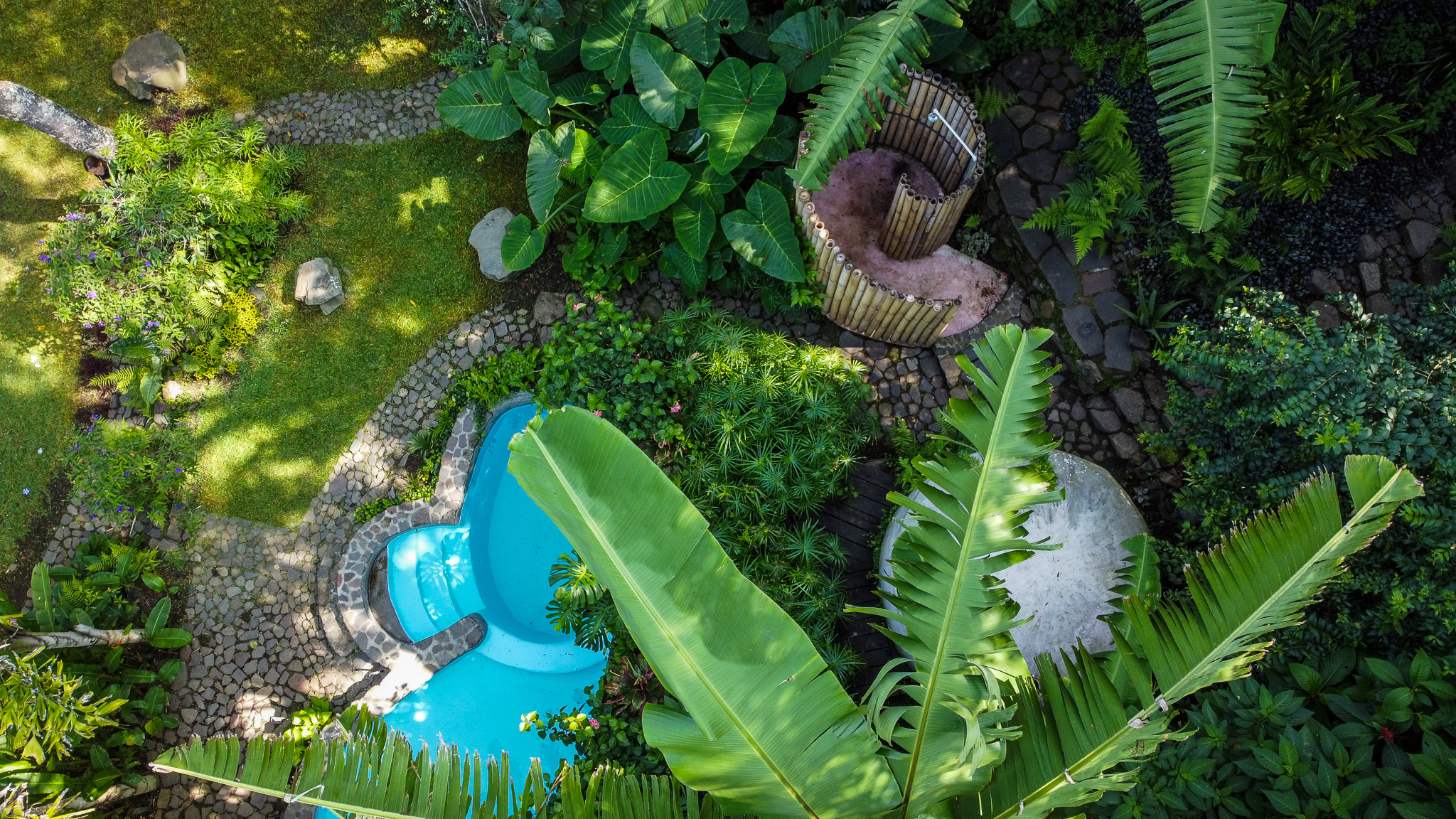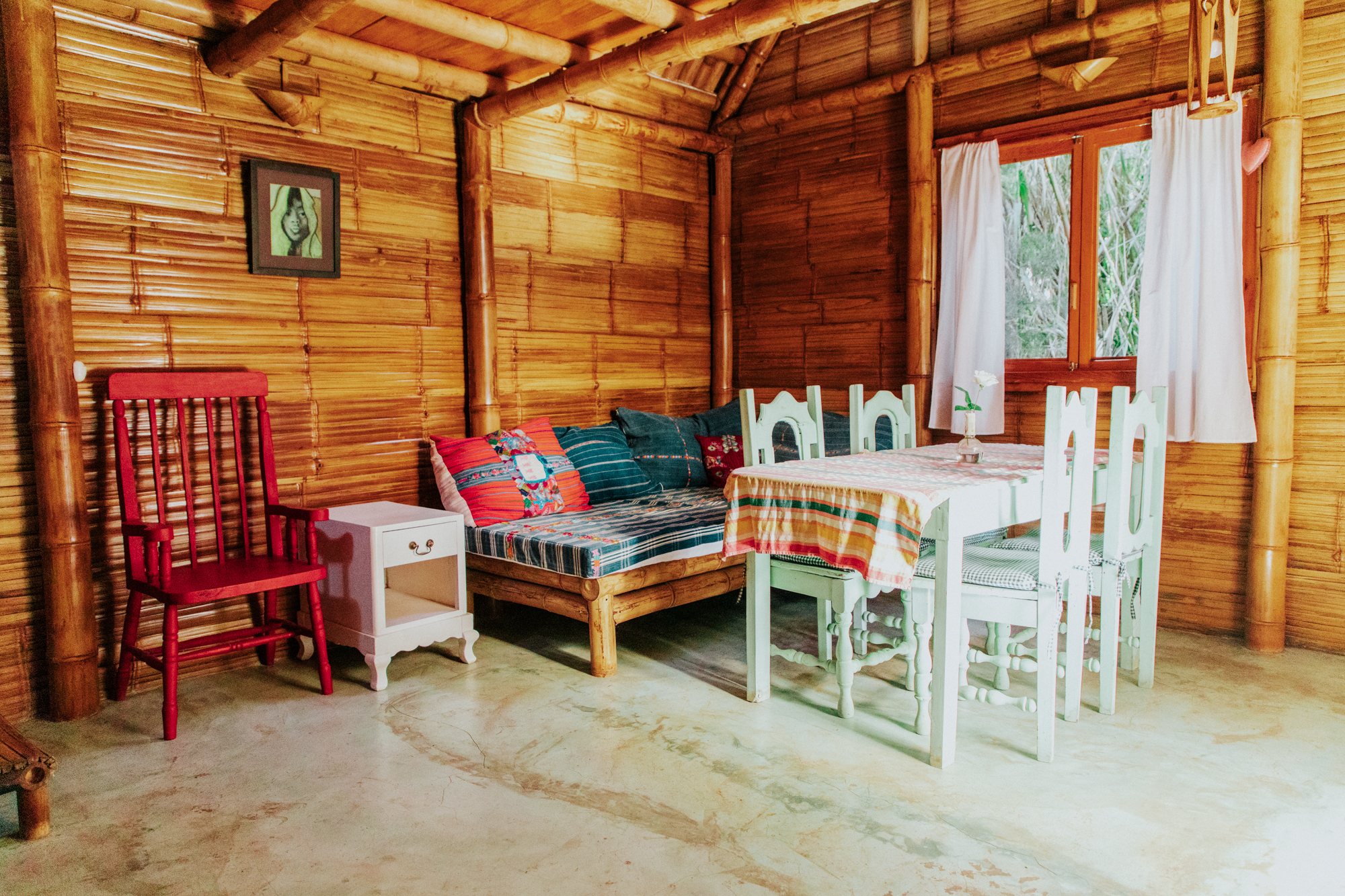Here you will find a massage cabin hidden amongst the raspberries, a chemical-free plunge pool – fed by our spring water well and, in turn, feeding the gardens – and our temazcal, a modern interpretation of a traditional Mayan sauna, created using traditional bajareque construction techniques and multi-functioning as a sound dome. The grounds are also home to a handmade beautiful outdoor shower and dry toilet, as well as covered parking for two cars.